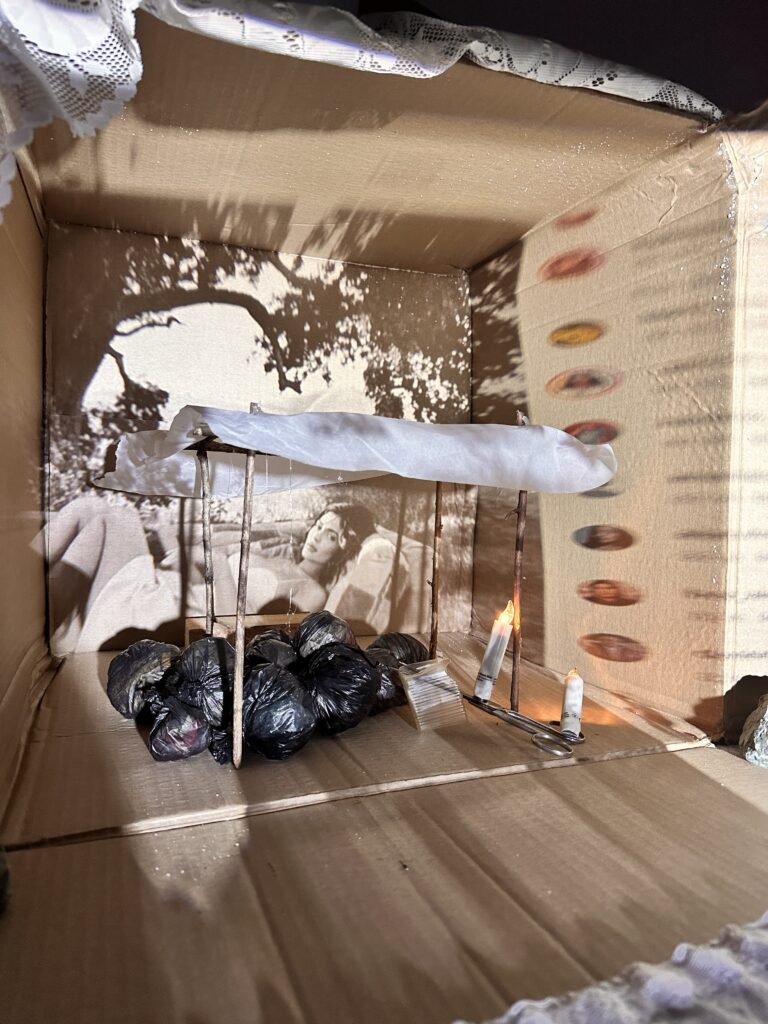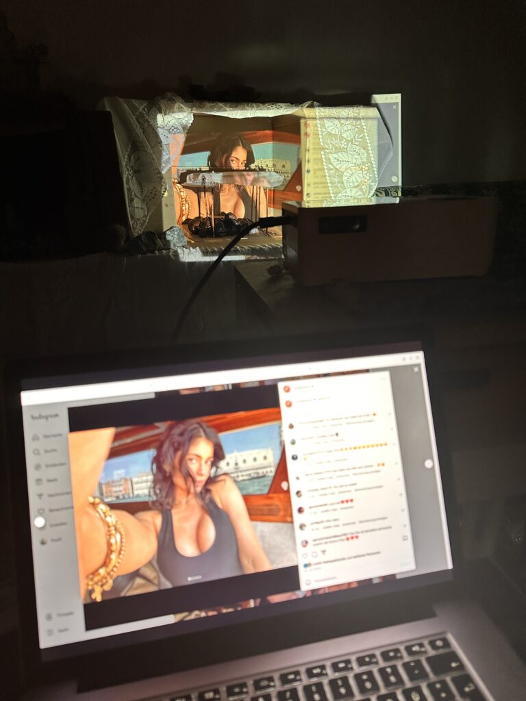 This work is an independent artistic creation that reinterprets and transforms an existing digital image through projection and spatial installation. By taking an image directly from Elon Musk’s Instagram account and projecting it into a miniature diorama, the original content is placed into a new physical and narrative environment, where it is recontextualized and staged differently before being rephotographed. Through this process, the image loses its original digital framework and becomes part of a larger artistic discourse on power, media influence, and constructed realities. The projection technique not only alters the image’s scale and materiality, but also shifts its meaning, questioning how visual culture shapes perception.