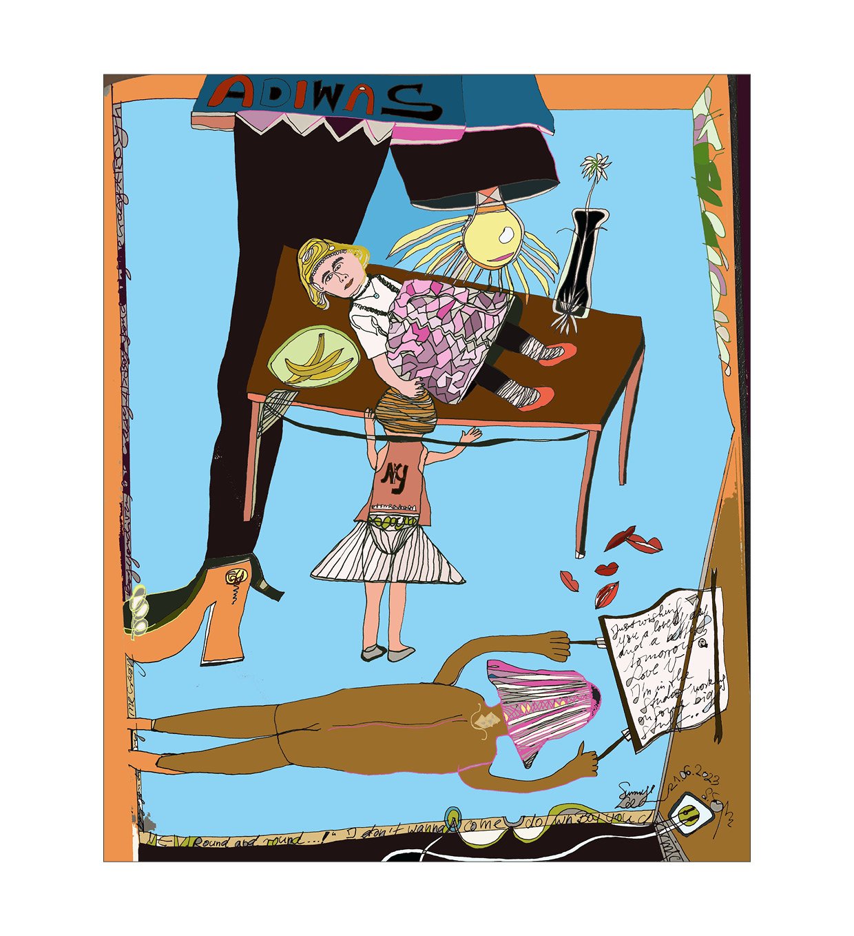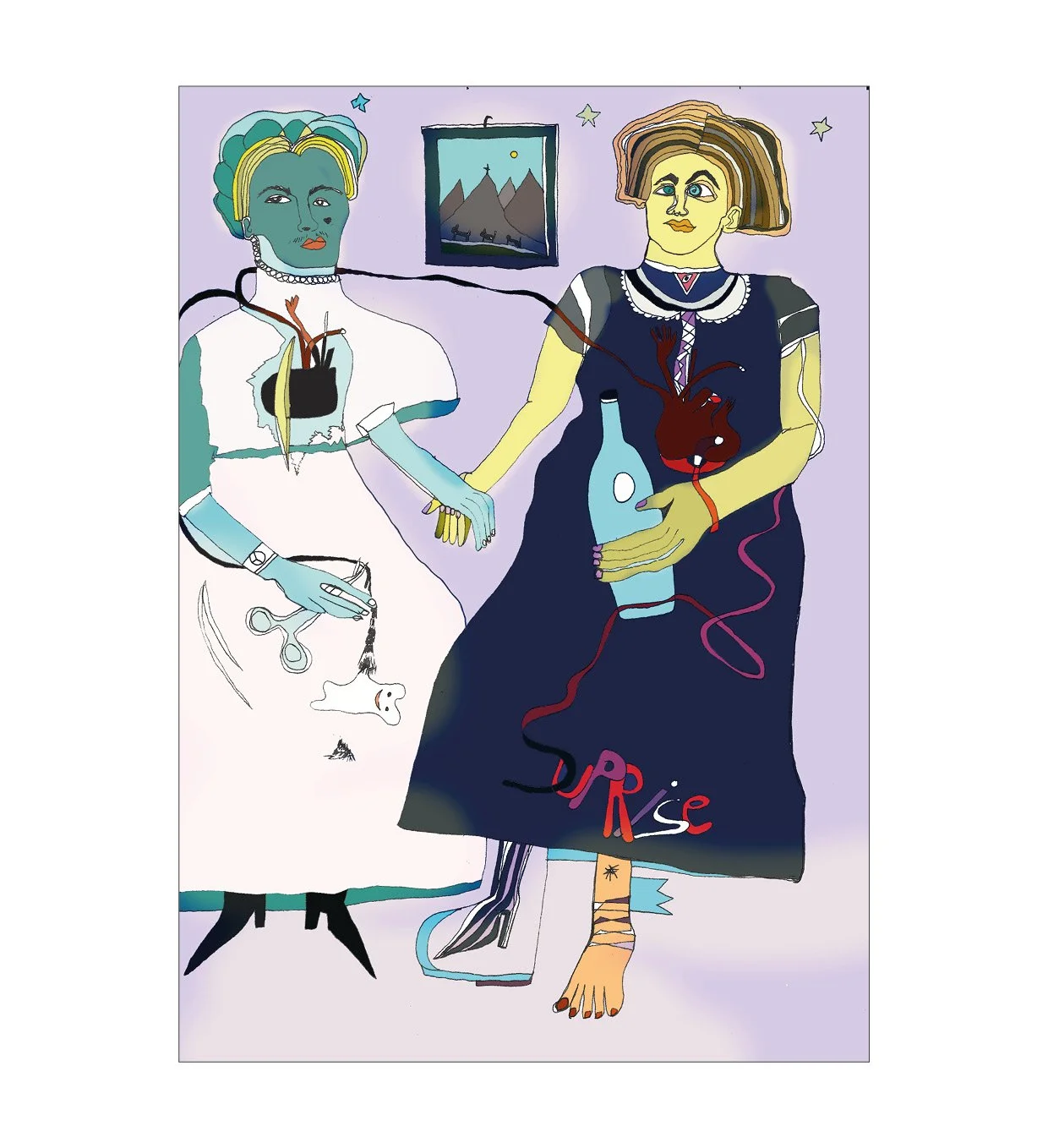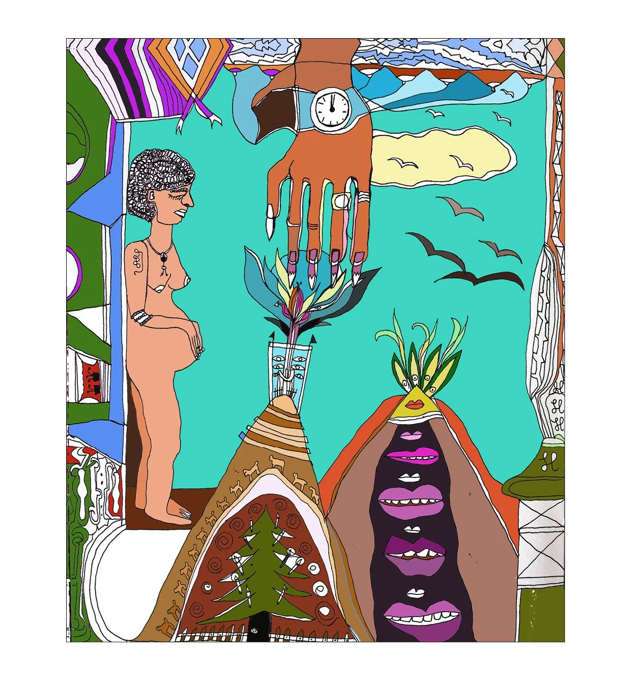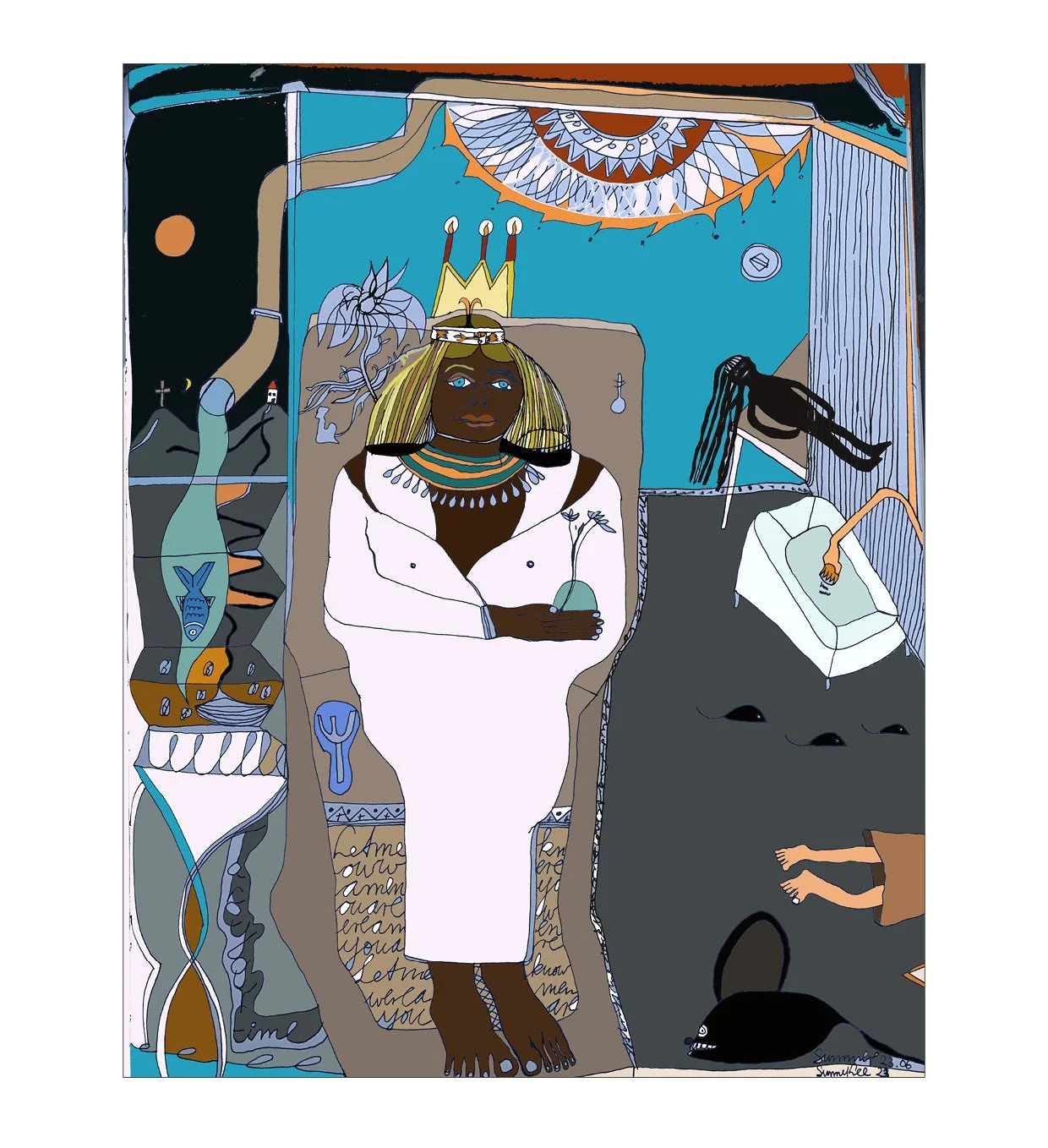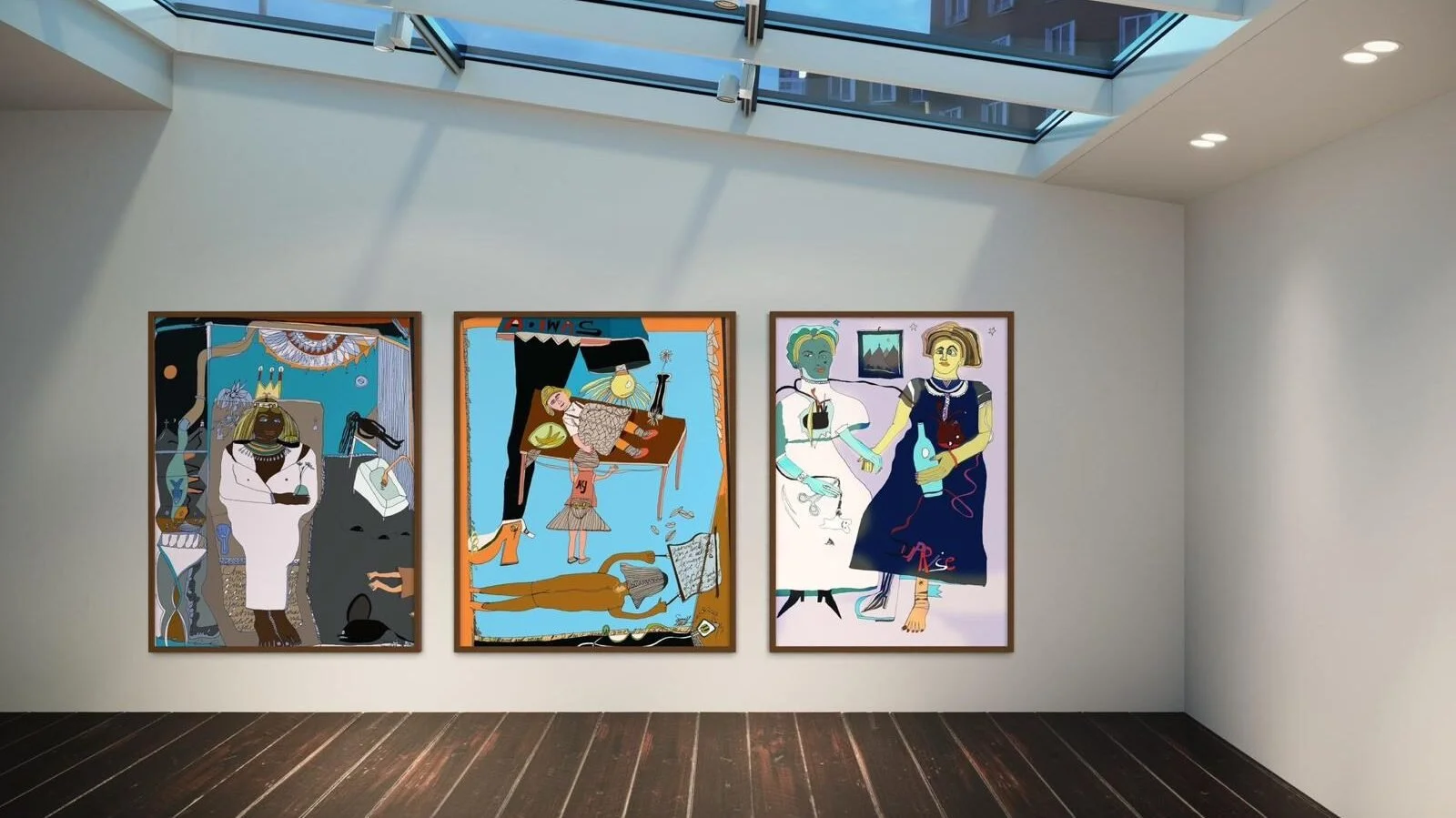 Hybrid Paintings combine traditional art techniques with modern digital technology. By merging paper sketches with digital coloring and design tools, I can experiment with diverse palettes and make creative decisions with greater flexibility. Working in layers allows for in-depth exploration and iteration, while each technique used—from the direct stroke of a pencil to innovative digital tools—enriches my artistic development. My works aim to provoke thought, evoke emotion, and invite viewers into a dialogue that goes beyond mere aesthetics, reflecting the complexity of contemporary life.