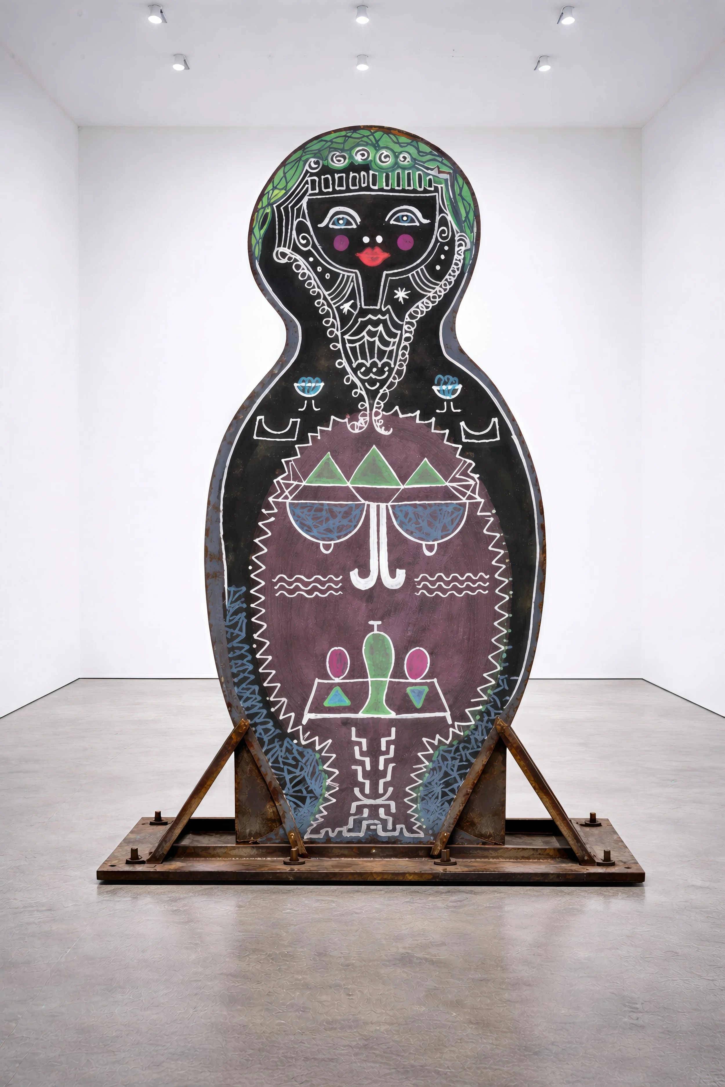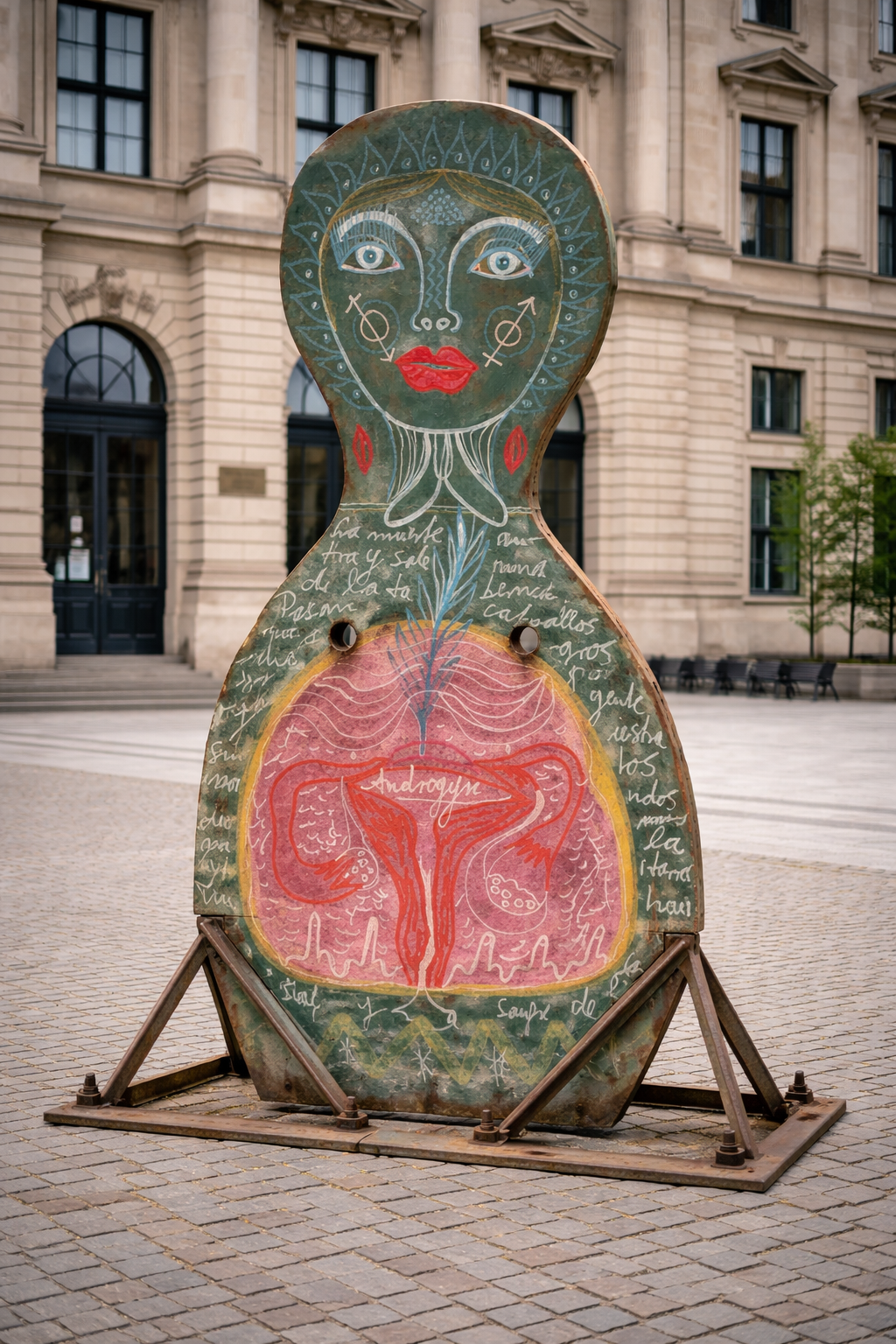 and is fixed there by means of a visible structural support. Iconic Mammas is an ongoing body of work that began as a series of drawings and paintings. The sculptural works translate these figures into public space as flat metal bodies, held by visible constructions. Motherhood is approached as a bodily, social, and political practice that sustains collective systems. The series is conceived as an open archive and is continuously expanded.